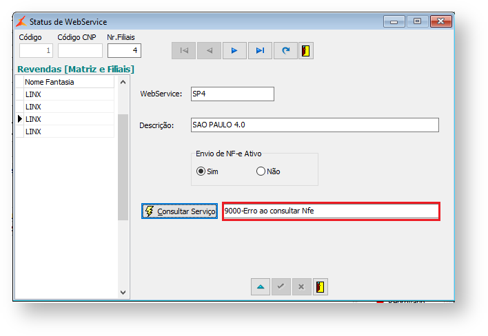 Ao acessar o menu Configuração > Cadastros > Status de webservice, ocorre o erro 9000-Erro ao consultar Nfe.