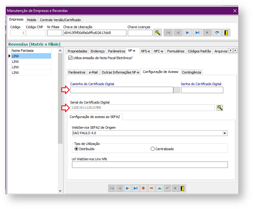 Obs.: Não é obrigatório informar o caminho do certificado, o mesmo é usado quando a revenda opta por não instalar o mesmo nas máquinas que emitem NF-e, ou quando é usado o modo centralizado para emissão de notas. Porém as máquinas precisam ter acesso ao diretório informado (caso o mesmo esteja informado) ou ter o certificado instalado nas máquinas (quando não está informado o caminho do certificado digital).