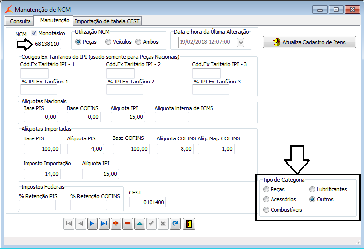 - No Linx DMS/BRAVOS, menu "Configuração > Cadastros > NCM", foi incluído o quadro " Tipo de Categoria". Neste quadro, pode ser selecionada a opção "Peças", "Acessórios", "Combustíveis", "Lubrificantes" e "Outros". No atendimento de balcão e no encerramento de ordem de serviço, para os clientes que retém Imposto de Renda, o sistema verifica se este quadro novo possui alguma das opções marcadas, se tiver, será verificado no cadastro do cliente, qual o % do Imposto de Renda que deve ser considerado para calcular o I.R. do item em questão. Veja as imagens: