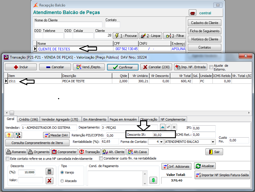 No atendimento de balcão e no encerramento de uma ordem de serviço, para este cliente parametrizado nas imagens acima, na venda desta peça, irá calcular 5% de Imposto de Renda. Veja a imagem: