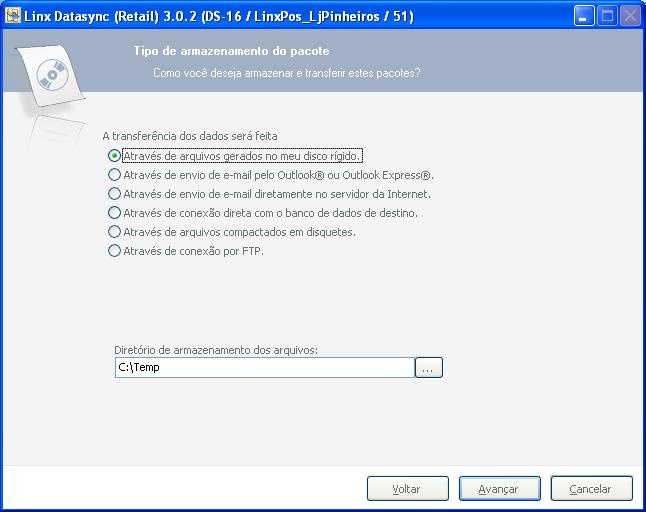 Será apresentada tela para seleção do tipo de armazenamento do pacote.