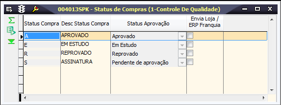 | Status Compra | Informe um código identificador para o de status de compra a ser cadastrado. Este campo é único e poderá ser utilizado para pesquisas. • A - Aprovado • R - Reprovado • E - Em estudo • S - Assinatura • P - Pendente de Aprovação. |