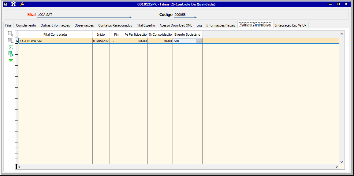 A tela 001013 - Filiais foi implementada com o uso da guia Matrizes Controladas, que será habilitada apenas para filiais que são matrizes contábeis. Esta guia permite incluir as empresas controladas por uma matriz contábil, bem como consultar informações de empresas controladas e controladoras, com o objetivo de garantir o fluxo de dados para a geração do Bloco K.