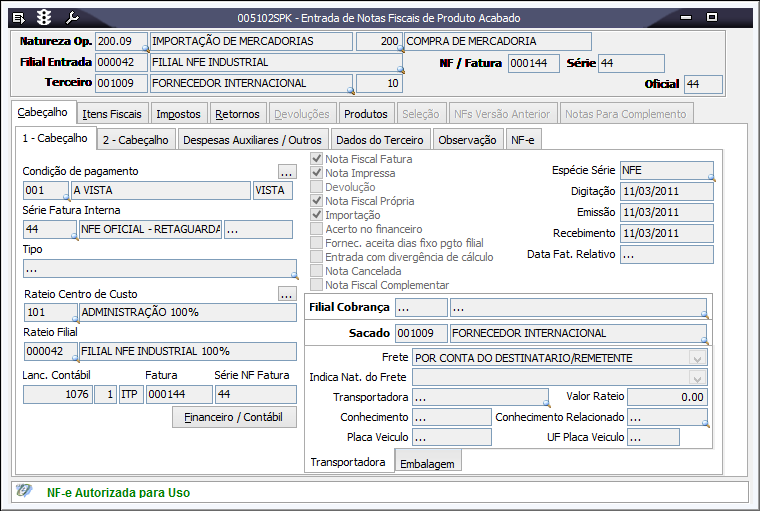 A tela de Entrada de Notas Fiscais de Produto Acabado permite o controle e recebimento de notas fiscais de pedidos de compra (para fornecedores) ou devolução (nota fiscal própria).