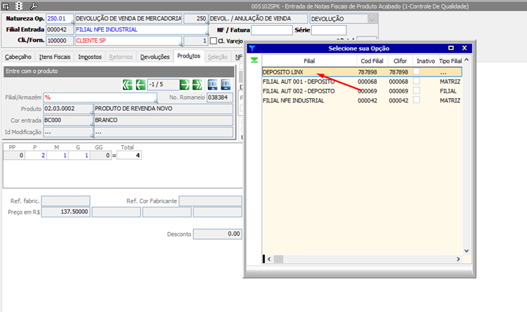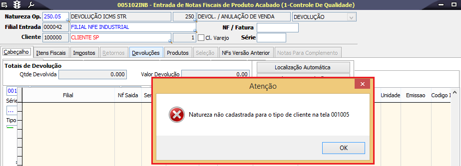 DevoluçõesUtilizada quando possui devolução de alguma nota de faturamento. Exemplo: O cliente comprou uma mercadoria e devolveu, e ao efetuar uma devolução de venda (Devolução de Saída), o sistema valida o saldo e na página Devoluções mostra as notas emitidas para o cliente. Caso também altere a quantidade devolvida, o sistema efetua o tratamento no cálculo para a quantidade devolvida. Importante:A tela 005102 - Entrada de Nota de Produto Acabado possibilita efetuar a validação da natureza de operação vinculada ao cadastro do tipo de clientes. Para permitir essa validação, na tela 014005 - Parâmetros altere para Sim o valor do parâmetro PERMITE_NAT_TIPO_CLIENTE. Em seguida, é necessário configurar os campos Natureza Entrada e Natureza Saída na tela 001005 - Tipo de Clientes. Observe os efeitos do preenchimento do parâmetro PERMITE_NAT_TIPO_CLIENTE = SIM 1. Na tela 005102 – Entrada de Notas Fiscais de Produto Acabado, ao selecionar uma devolução, será feita a validação com o tipo de cliente e com a natureza de operação e, automaticamente, esses valores serão atribuídos à operação de devolução: Caso ambas as naturezas (de entrada e saída) não estejam cadastradas na tela 001005 - Tipo de Clientes, na tela 005102 - Entrada de Notas Fiscais de Produto Acabado, ao selecionar a natureza de operação, a filial de entrada e o cliente, será exibida uma mensagem de bloqueio e não será possível concluir a operação: 2. Caso isso ocorra, acesse novamente a tela 001005 e cadastre ambas as naturezas para esse tipo de cliente. Caso o parâmetro PERMITE_NAT_TIPO_CLIENTE esteja com o valor igual a NÃO, não será verificada a configuração da operação por tipo de cliente, não havendo bloqueio da nota pela tela 005102 por esse motivo. Melhoria para entrada de devolução de NF de Saída - disponível a partir do Service Pack 01.23 Hotfix 030Em qualquer retorno ou devolução de notas fiscais de saída, ao alterar a Filial/Armazém primeiro item, se clicar no botão Alterar a Filial/Armazém para todos os outros itens o sistema irá apresentar a mensagem "Deseja alterar a Filial/Armazém para todos os outros itens?" Se SIM vai aplicar a Filial/Armazém para todos os outros itens; Se NÃO, não vai aplicar para os demais itens. | ||||||||||||||||||||||||||||||||||||||||||||