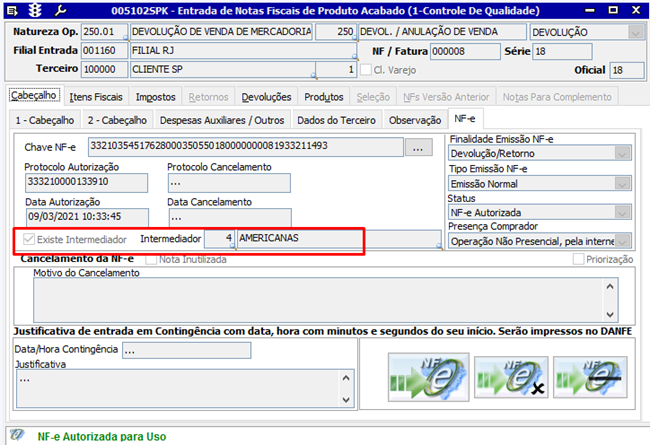 A fim de atender a Nota Técnica 2020.006 que divulga novos campos e regras de validação para a NF-e/NFC-e versão 4.0, visando a adequação ao disposto no Ajuste SINIEF 21/2020 e 22/2020, que envolve a identificação do intermediador ou agenciador em operações comerciais, a tela 005102 - Entrada de Notas Fiscais de Produto Acabado recebeu implementações para operação que possuam um intermediador ou marktplace. Nesses casos, preencha o campo Presença Comprador com uma das opções abaixo: