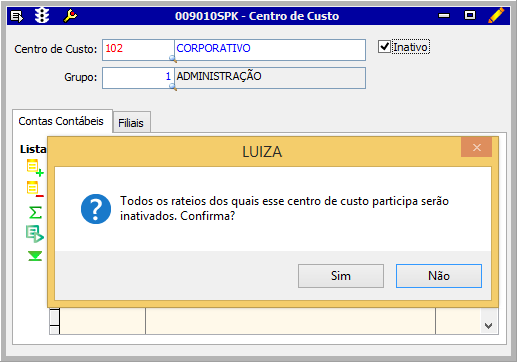 Ao clicar em Sim, serão inativados o centro de custo e também todos os rateios dos quais ele faça parte.