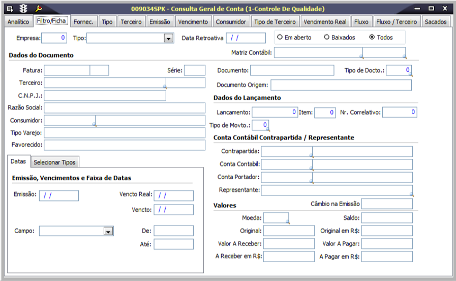 A tela 009034 - Consulta Geral de Conta tem por finalidade concentrar as consultas ao saldo de contas que podem ser filtradas por tipo: Cartão de Crédito, Aviso de Débito, Aviso de Crédito, Cheques Emitidos, Verba Receber e Verba Pagar, por Data Retroativa e por títulos Em Aberto, Baixados e Todos.