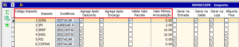 Na guia Itens da tela de exceção, ao incluir o imposto, as colunas ID Imposto, ImpostoAgrega Após DescontoAgrega Após EncargoIncidênciaValor Mínimo de Arrecadação e Valida Valor Parcela serão preenchidas de acordo com o que está parametrizado na tela 009003 - Imposto.