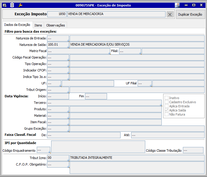 A tela 009075 - Exceção de Imposto utiliza as informações da tela 009003 - Imposto.
