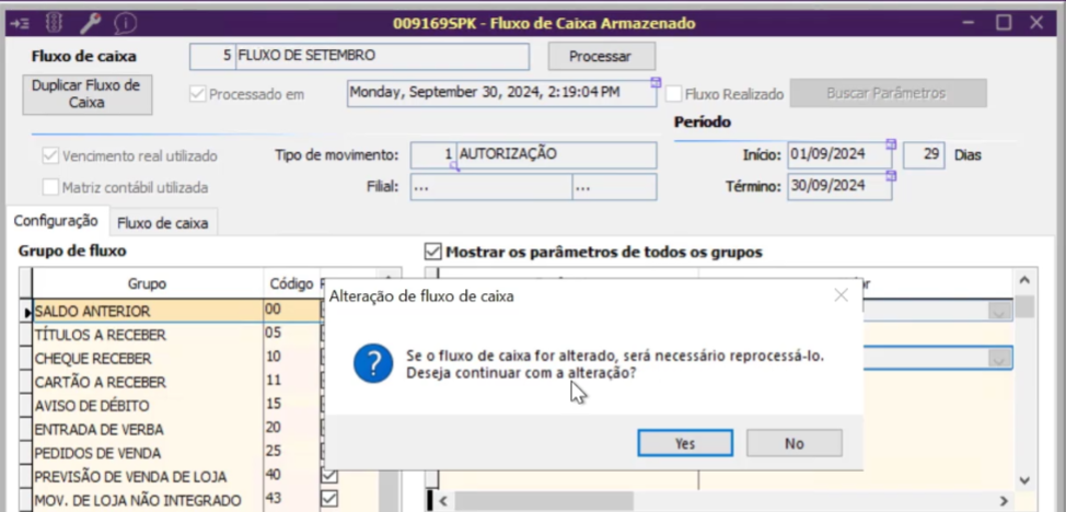 Se o fluxo de caixa for alterado, será necessário reprocessá-lo. Deseja continuar a alteração?