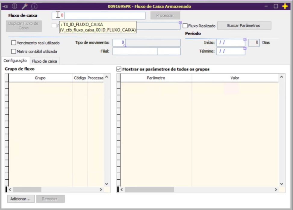 As configurações do grupo de fluxo são pré-definidas na tela 009168 – Cadastro de Grupo para o Fluxo de Caixa. Recomenda-se que apenas usuários com conhecimento técnico façam alterações.
