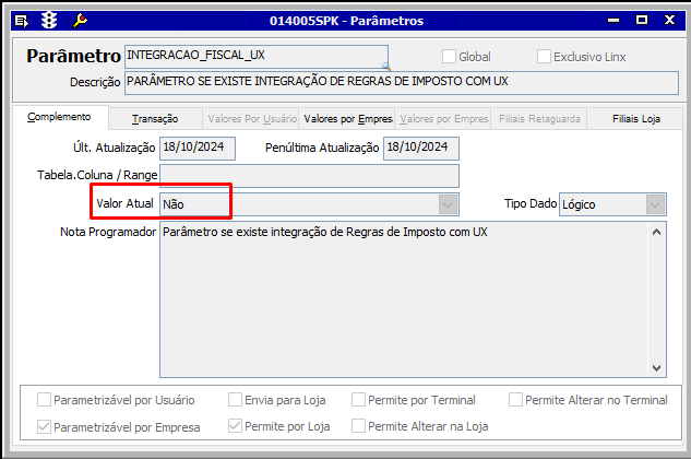INTEGRACAO_FISCAL_UX por padrão fica com o Valor Atual NÃO.