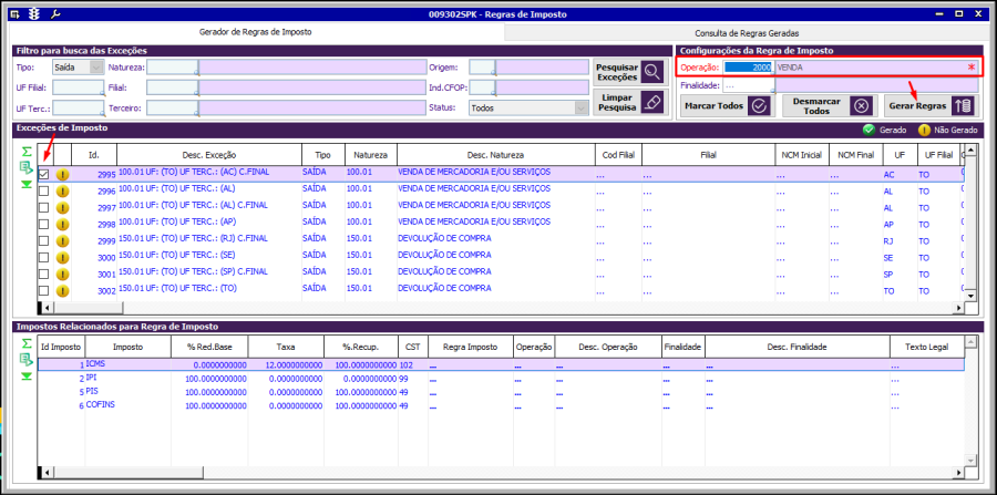 - Para gerar uma rega é preciso selecionar a Exceção de imposto na grid Exceções de Imposto. Escolher a OPERAÇÃO (É um campo obrigatório) e clicar no botão Gerar Regras
