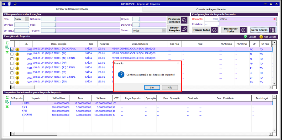 - O sistema emite uma mensagem de Atenção para confirmar a geração da Regra de Imposto: Confirma a geração das Regras de Imposto?