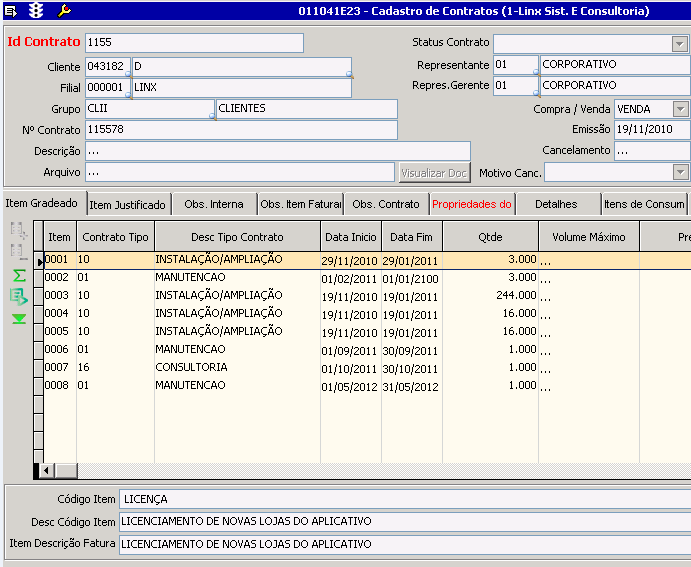 Inicialmente, pode associar o cadastro a um item fiscal, que normalmente é utilizado para cadastrar despesas fixas que a empresa teve ou terá. Essa funcionalidade está disponível na tela 011041 - Cadastro de Contratos. Nela, constam todas as informações e associações pertinentes ao contrato.