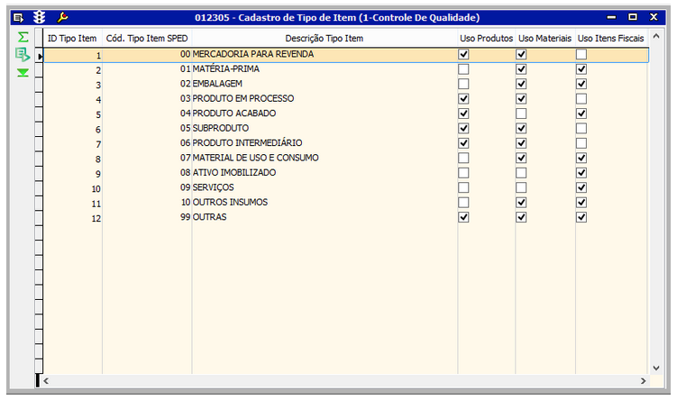 A tela 012305 irá definir quais serão os Tipo Item SPED que irão aparecer para serem associados nas telas 100126 - Cadastro de Itens Fiscais, 002006 - Produtos Acabadose 003008 - Materiais. Ela apresenta 12 opções de Tipo Item SPED disponíveis.