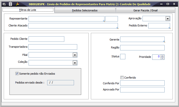 Nesta tela 080028 - Envio de Pedidos de Representantes para Matriz, é possível enviar pedidos de produtos para a matriz, através de e-mail. Cadastre os pedidos previamente na tela 080001 - Pedidos de Venda de Produtos Acabados, e utilize esta tela para fazer o envio.