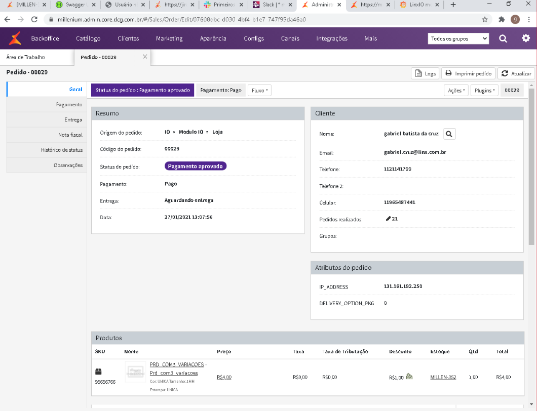 -Abaixo podemos observar o pedido no commerce com pagamento aprovado