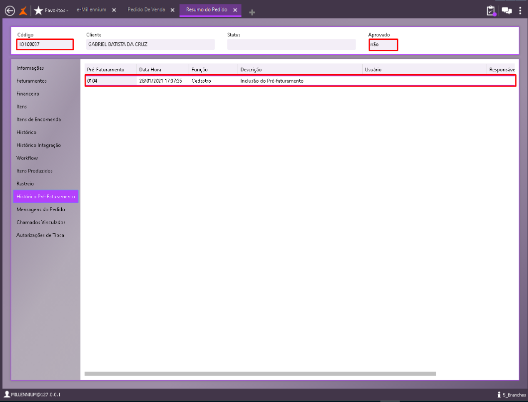 -Código e descrição de Pré-faturamento (Não Aprovado)