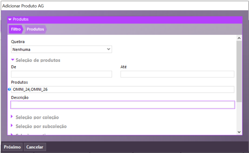 Na tela seguinte, o usuário deverá selecionar os produtos que farão parte do look que está sendo criado. Os itens podem ser selecionados por códigos, departamento, coleção, marca etc. Vamos selecionar apenas dois itens para demostrar como funciona o recurso.