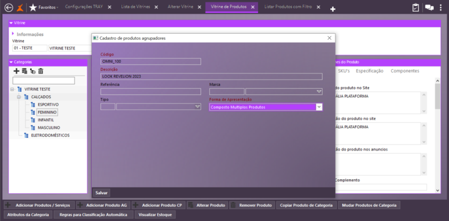 Em Produtos e Serviços\Cadastros\Vitrines, selecione a opção Vitrine de Produtos. A seguir, selecione a vitrine na qual o look será criado.