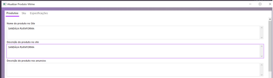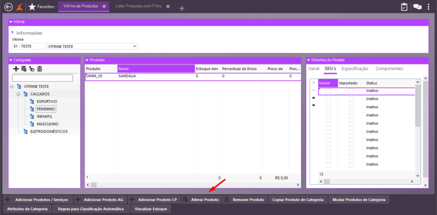 Atenção! A alteração do produto feita na vitrine, não altera as informações do cadastro do produto.
