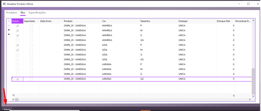 Selecione a guia SKU e marque os tamanhos a serem disponibilizados no site. Faça o mesmo para as especificações e clique em Salvar.