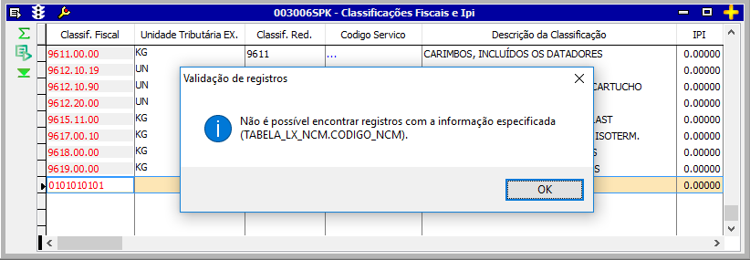 Se no campo Classif. Fiscal for digitado um NCM que não exista na tabela TABELA_LX_NCM, a tela apresentará a mensagem: