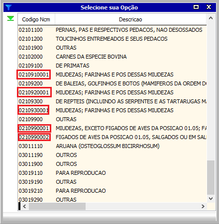 Ao clicar com o botão direito do mouse na coluna Classif. Fiscal, a tela 003006 abrirá uma seleção com todas as NCM do governo, vindas da tabela TABELA_LX_NCM.