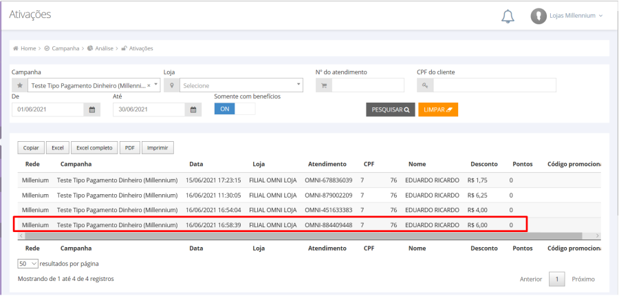 Assim que o Reshop identifica o tipo de pagamento, é feita uma pesquisa e verificado que há uma campanha configurada para premiar as vendas registradas com aquele tipo determinado de pagamento. No exemplo abaixo, será concedido um desconto para as vendas realizadas com pagamento em dinheiro.