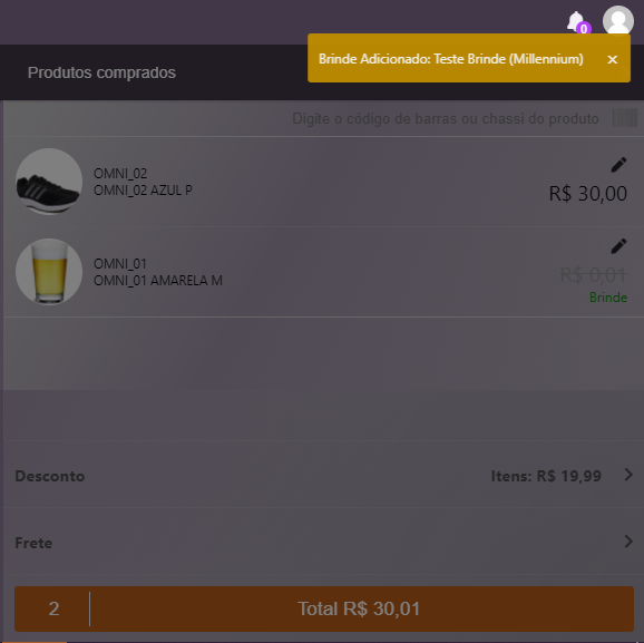 Perceba que o brinde foi lançado na tela com o valor de R$ 0,01, isso porque a legislação não permite que tenha itens com valor zero no cupom fiscal. Após a inclusão do brinde na tela de venda, finalize a operação comercial.