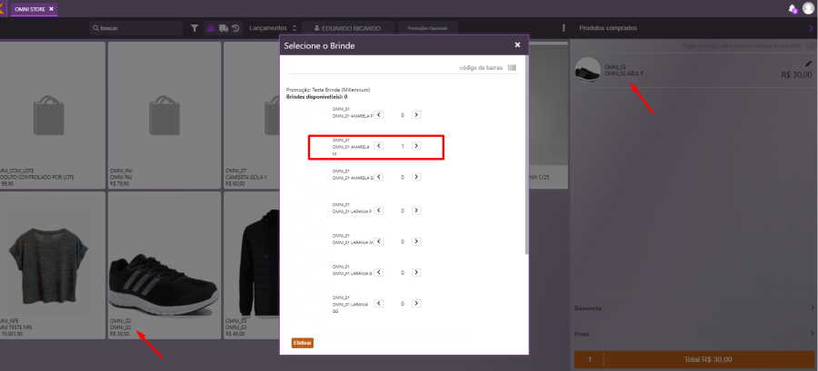 Assim que o produto promocional for selecionado na tela de venda, o PDV OMNI fará a consulta no Reshop e, ao identificar a campanha que concede o brinde, o sistema exibirá na tela o brinde ao qual o cliente tem direito. No exemplo abaixo, o brinde é uma camiseta e PDV OMNI exibirá a grade do produto para que o cliente possa escolher tamanho e cor.