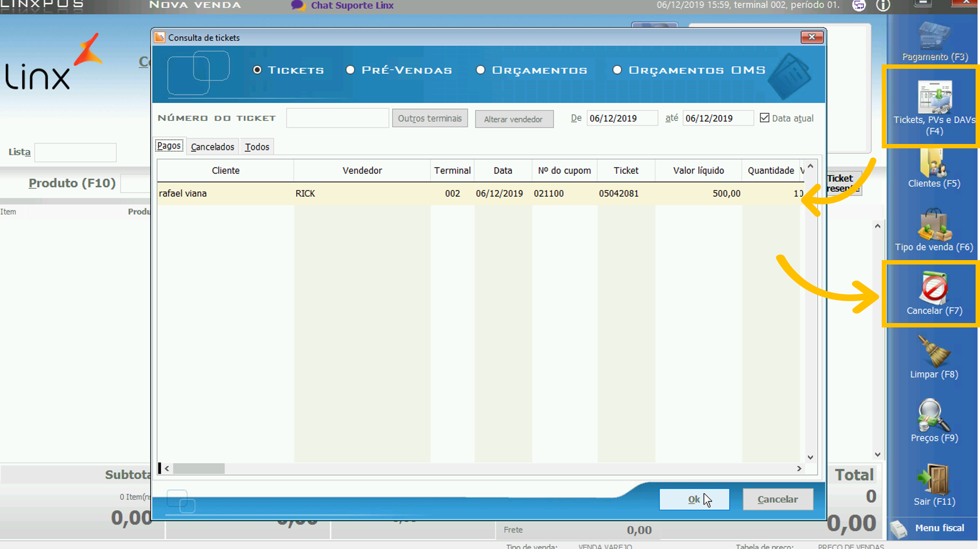 1 - Na tela Nova Venda, clique em Tickets, PVs e DAVs (F4). Em seguida, selecione entre os tickets pagos qual deverá ser anulado e clique em Cancelar (F7).