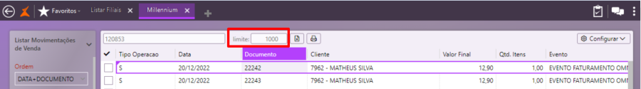 Clique no campo Limite e digite a quantidade que for considerada adequada a consulta realizada. Caso o banco de dados seja muito grande, ou o intervalo de datas seja muito extenso, é recomendável que esse limite seja alterado, para não correr o risco de o registro esperado não ser listado na tela.
