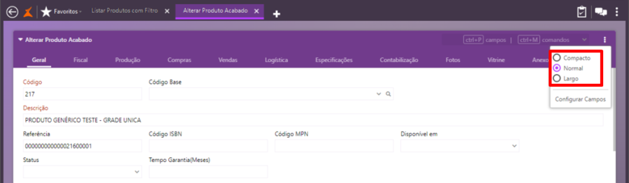 Ao selecionar a opção Compacto, observe a alteração na disposição dos campos da tela.
