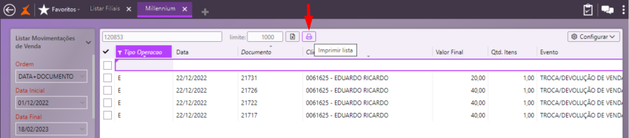 Os resultados das consultas apresentados na tela também podem ser impressos. Basta clicar no botão Imprimir Lista e selecionar uma pasta para salvar o arquivo gerado em PDF ou uma impressora.