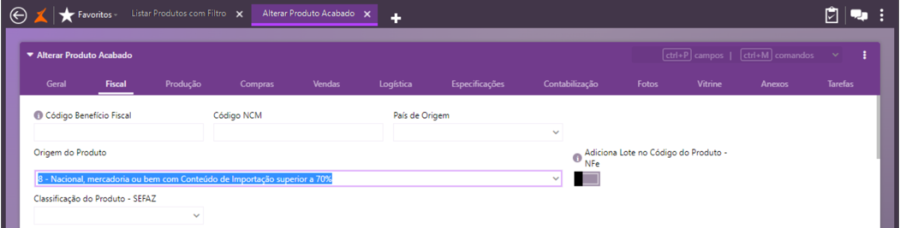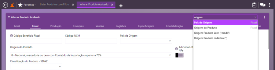 Selecione a opção Campos e digite parte do nome do campo que precisa localizar. O sistema exibirá todos os campos do cadastro que contenham a palavra digitada e a aba na qual ele está inserido.