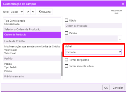 | Selecione o filtro a ser excluído, por exemplo ORDEM DE PRODUÇÃO, e no campo Visível, selecione a opção Esconder | |
