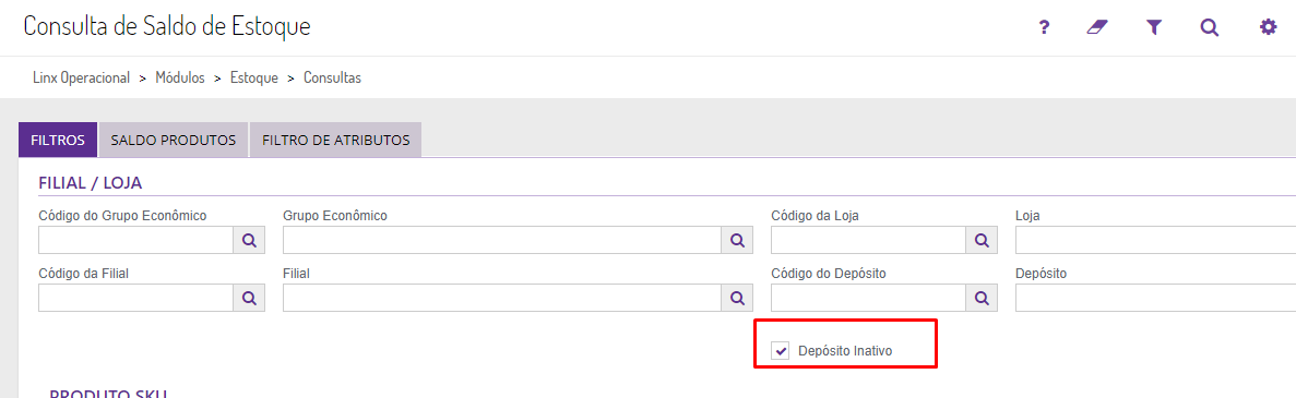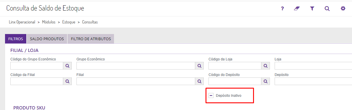 Melhoria realizada na tela Consulta de Saldo de Estoque. Mediante tratativa, quando selecionado o item Depósito Inativo, o mesmo apresenta resultados da seguinte forma: