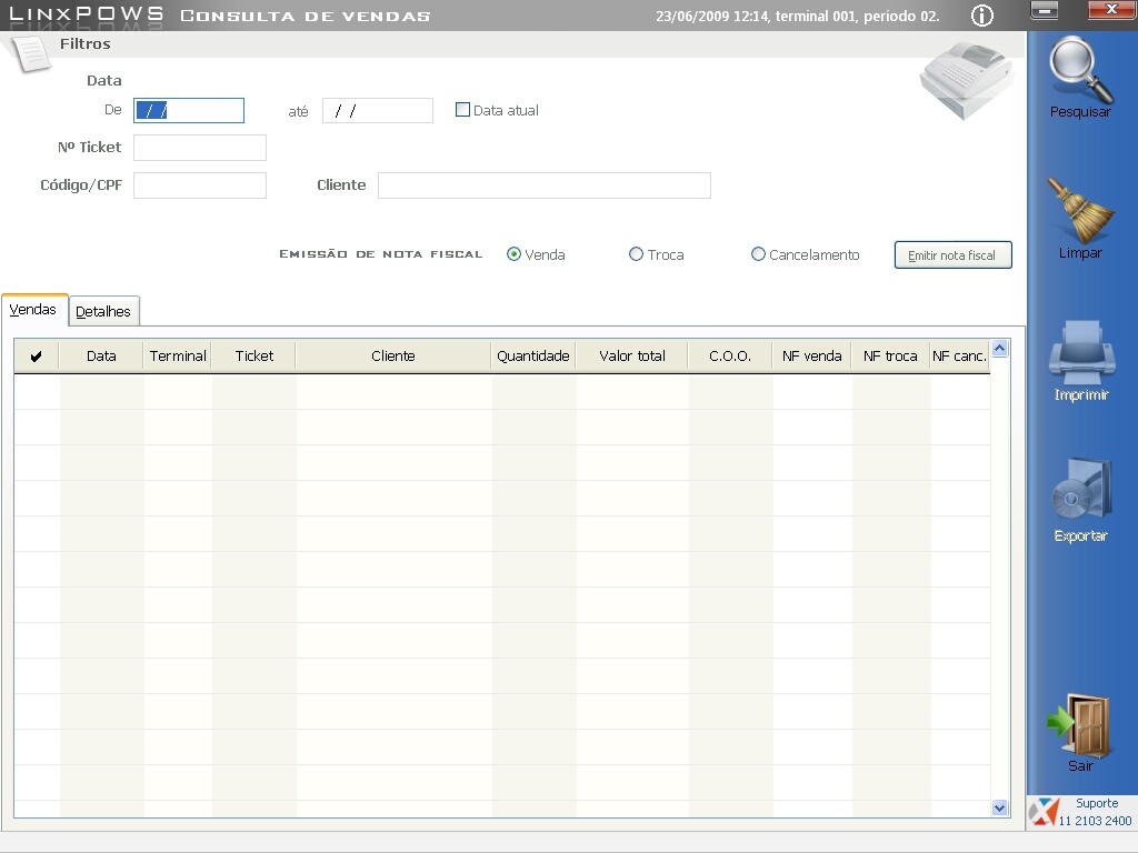 O sistema permite ainda a emissão da Nota Fiscal de Venda, Troca ou Cancelamento.