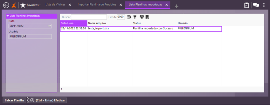 Ao clicar no link, será aberta a tela de consulta/baixa de planilhas importadas.