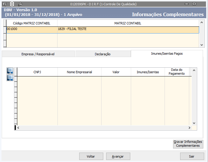 4. Clique em Avançar e a tela Informações Complementares será exibida. Selecione os registros apresentados nas guias Empresa/Responsável , Declaração e Imunes/Isentas Pagas