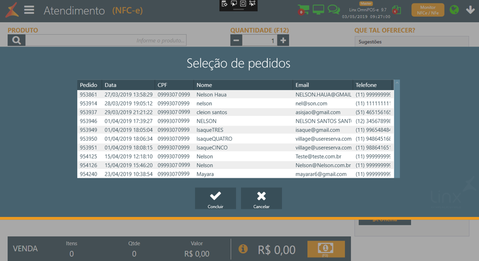 4) Será exibida a tela Seleção de Pedidos. Faça a escolha de um pedido e pressione Concluir.