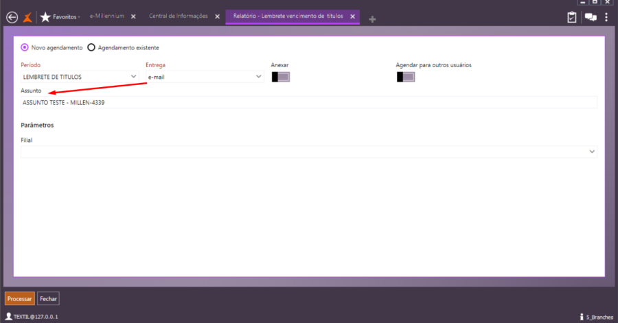 Crie um novo agendamento selecionando a opção "E-mail" e, ao selecioná-lo, irá aparecer o campo "Assunto". Preencha este campo.