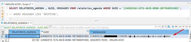 Para sanar a dúvida sobre o agendamento ter sido gravado no banco de dados corretamente, procuramos o registro que continha o erro e o novo registro que geramos.