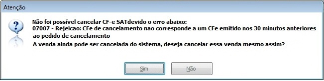12 | Exibir mensagem e verificar se operador deseja cancelar a venda | Linx POS exibe mensagem sobre a impossibilidade de cancelar o CF-e-SAT. Exibe mensagem ao operador perguntando se deseja cancelar a venda no Linx POS mesmo assim. Se operador responder Não, seguir para o passo 13 e fim do fluxo. Se operador responder Sim, seguir para o passo 14. |