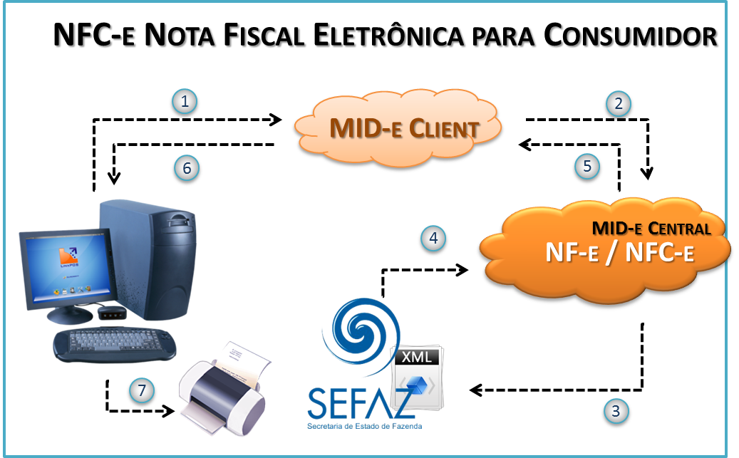 1. A NFC-e é emitida pelo contribuinte utilizando um programa emissor (Linx POS) e enviada para um aplicativo Midware (Mid-e Client), que deve ser instalado nos computadores da empresa. Após parametrização, o Linx POS compartilhará as informações com o Mid-e Client.