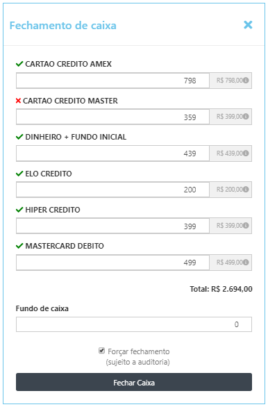 No caso de haver divergência entre os valores, o responsável pode realizar uma nova conferência ou forçar o fechamento, deixando para fazer uma auditoria posteriormente.