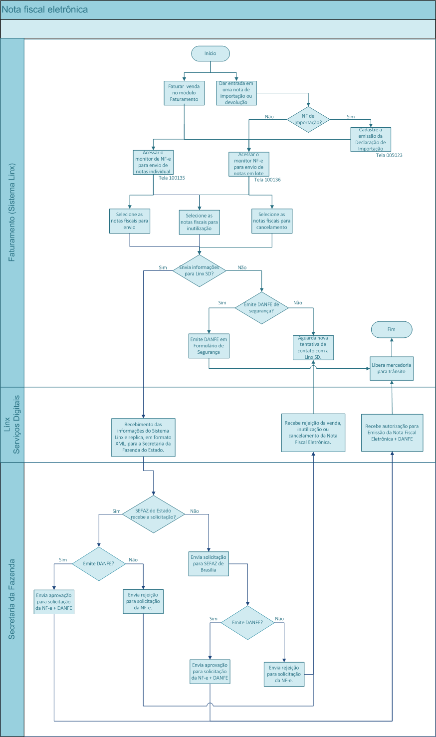 Para facilitar o entendimento do processo de geração, aprovação e emissão da DANFE, verifique o fluxograma de processo a seguir: